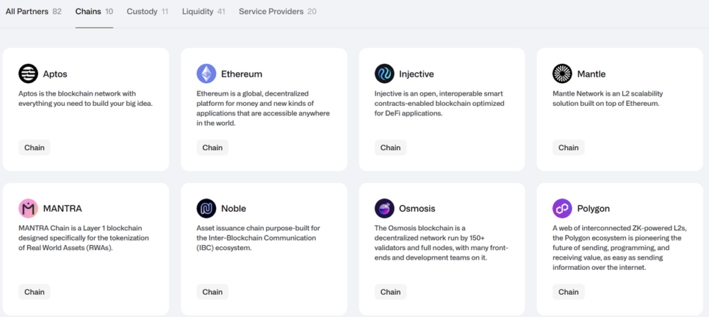 ONDO Finance 在历史上进行了三轮融资,共获得融资 3400 万美元,投资方有 PanteraCapital、CoinbaseVentures、TigerGlobal、Wintermute 等等知名机构。除此之外,ONDO Finance 在链支援、资产讬管、流动性支援和服务设施四个领域有多达 82 个合作伙伴。