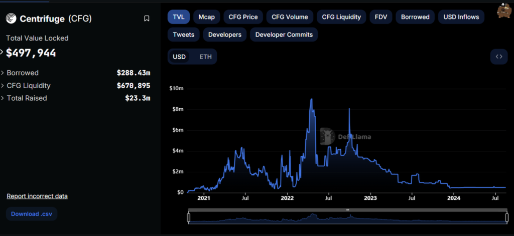 虽然 Centrifuge 专案在 RootData 的 RWA 专案关注度排行第一,但核心资料如 TVL 等却在 2022 年熊市影响以及 2024 年专案预期落空等等因素的共同作用下一路下滑,目前仅有 497944 美元。