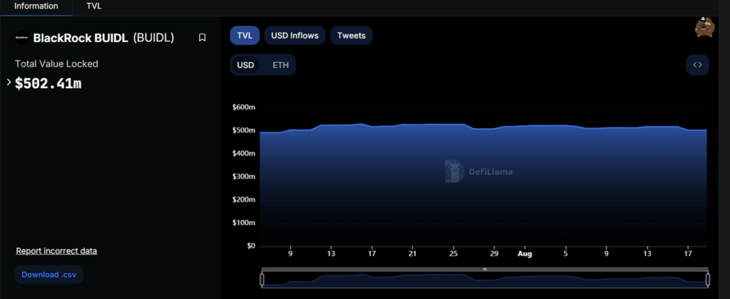在贝莱德公司本身实力和名望的加持下,BUIDL 基金在市场认可度、TVL 等资料上非常不错,TVL 稳定在 502.41m 美元,RWA TVL Ranking 第 4 名。
