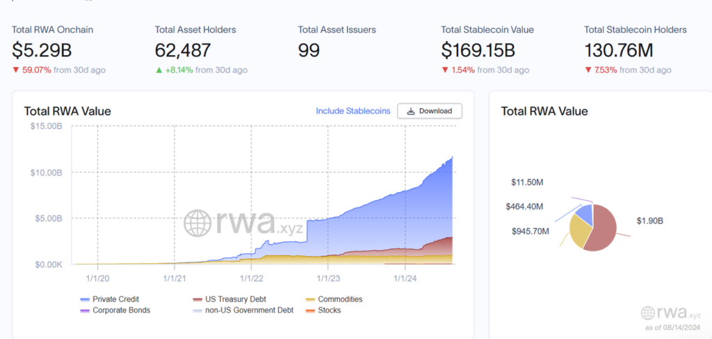 据 RWA.xyz 官网资料,RWA 相关资产持有者多达 62487 人,资产发行方数量为 99,稳定币总价值 1690 亿美元。