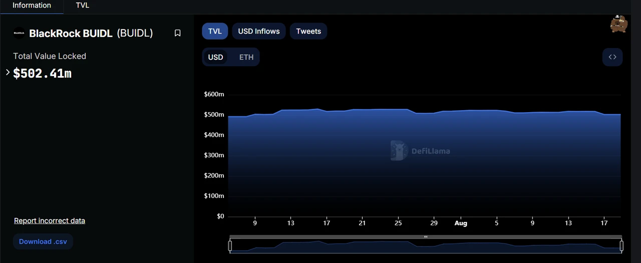 在贝莱德公司本身实力和名望的加持下,BUIDL 基金在市场认可度、TVL 等数据上非常不错,TVL 稳定在 502.41 m 美元,RWA TVL Ranking 第 4 名。