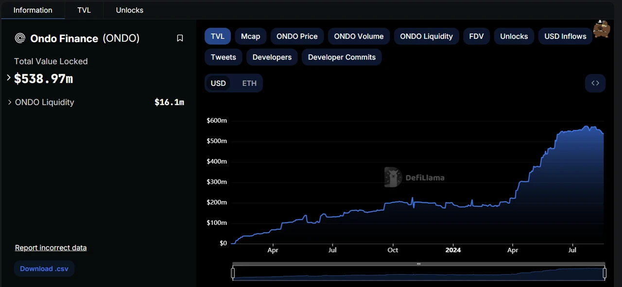 在 TVL 等关键数据上,ONDO Finance 在今年 4 月以来迎来显著增长,目前高达 538.97 m 美元,在 RWA 赛道中排名第三。