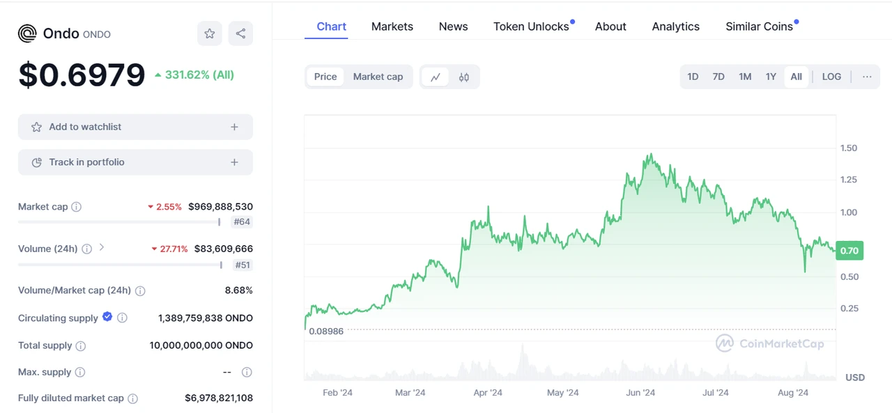 ONDO Finance 的市场表现同样不俗,当前项目代币 ONDO 价格 0.6979 美元,与 A 轮融资价格 0.0285 美元、ICO 融资 0.055 美元和开盘价格 0.089 美元相比,分布上涨 2448% 、 1270% 和 784% ,展现了市场对项目的狂热追捧。