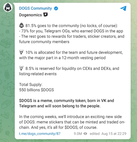 8 月 15 日,DOGS 在 Telegram 社区发布代币经济学,DOGS 代币总供应量为 550,000,000,000 枚,具体分配方式为: