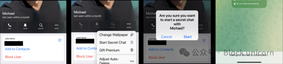 在最新的 Telegram iOS 应用中开始与我的朋友 Michael 的「加密聊天」,从普通的聊天界面中,这个选项并不直接可见。激活它需要四次点击:
