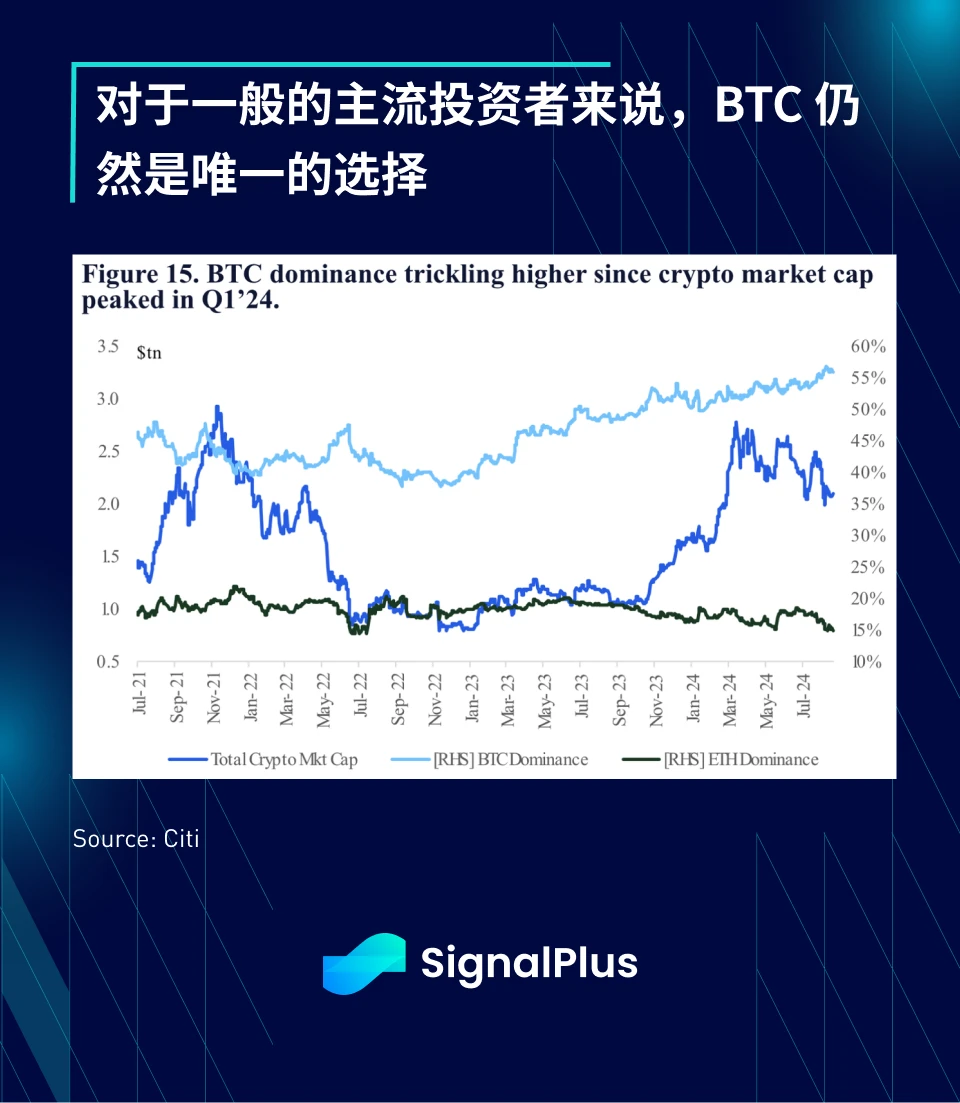 这导致 BTC 的主导地位继续单向上升,加密货币越来越被视为一种替代资产类别(例如石油),而一般的主流投资者更倾向于仅参与指标性代币(BTC),因其对非技术投资者来说代表“价值储存”这一简单明了的价值主张。