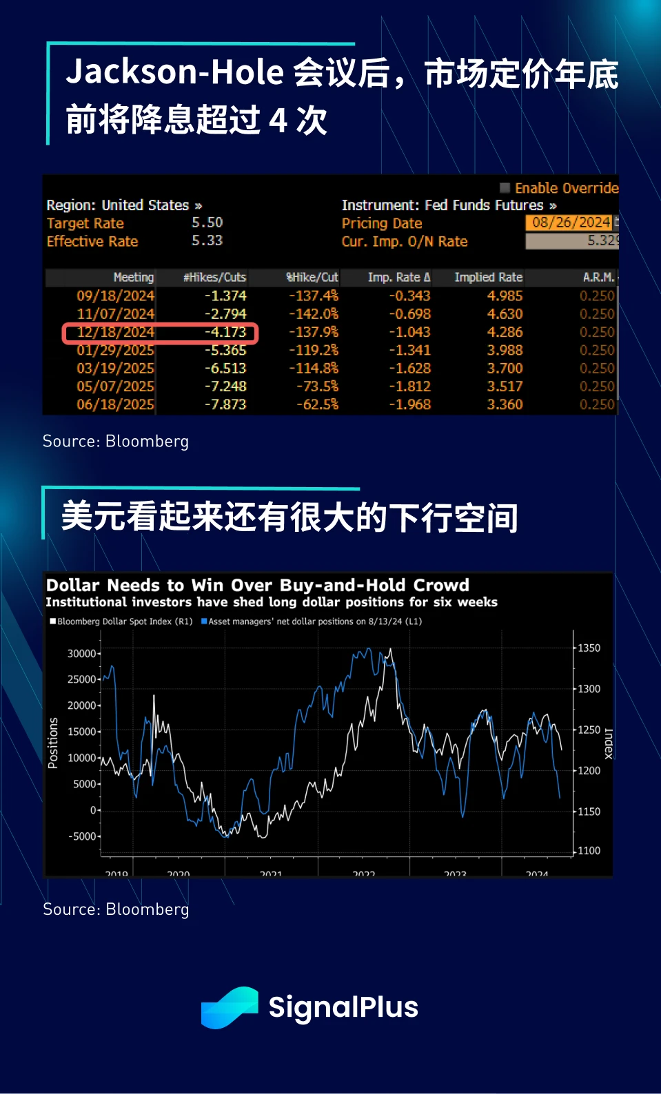 人们对今年的 Jackson Hole 会议抱有很高的期望,历史上美联储经常利用这一平台来宣告重大政策转向或强力重申政策倾向,在 24 个月前的 2022 年 8 月,市场就曾因 Powell 的极端鹰派言论而大幅下挫,股市当天暴跌 3.4% ,并在接下来的一个月下跌 12% 。这次会议举行之际,市场刚刚摆脱了 8 月初的“历史性”单日崩盘,并收复了大部分的亏损,这要归功于市场提前对鸽派美联储的预期,定价反映年底前将降息约 4 次,而一个月前的定价还不到 2 次降息。市场非常好奇这次主席是否会满足我们的期待,还是会给我们泼一盆冷水?