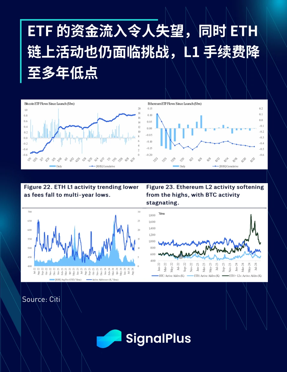 自推出以来,ETF 的资金流入一直很少,尤其是 ETH,受到了时机不佳(8 月风险抛售)和 ETH 链上活动疲弱的影响,随著收入集中在 L2s,L1 手续费已经跌至多年低点。
