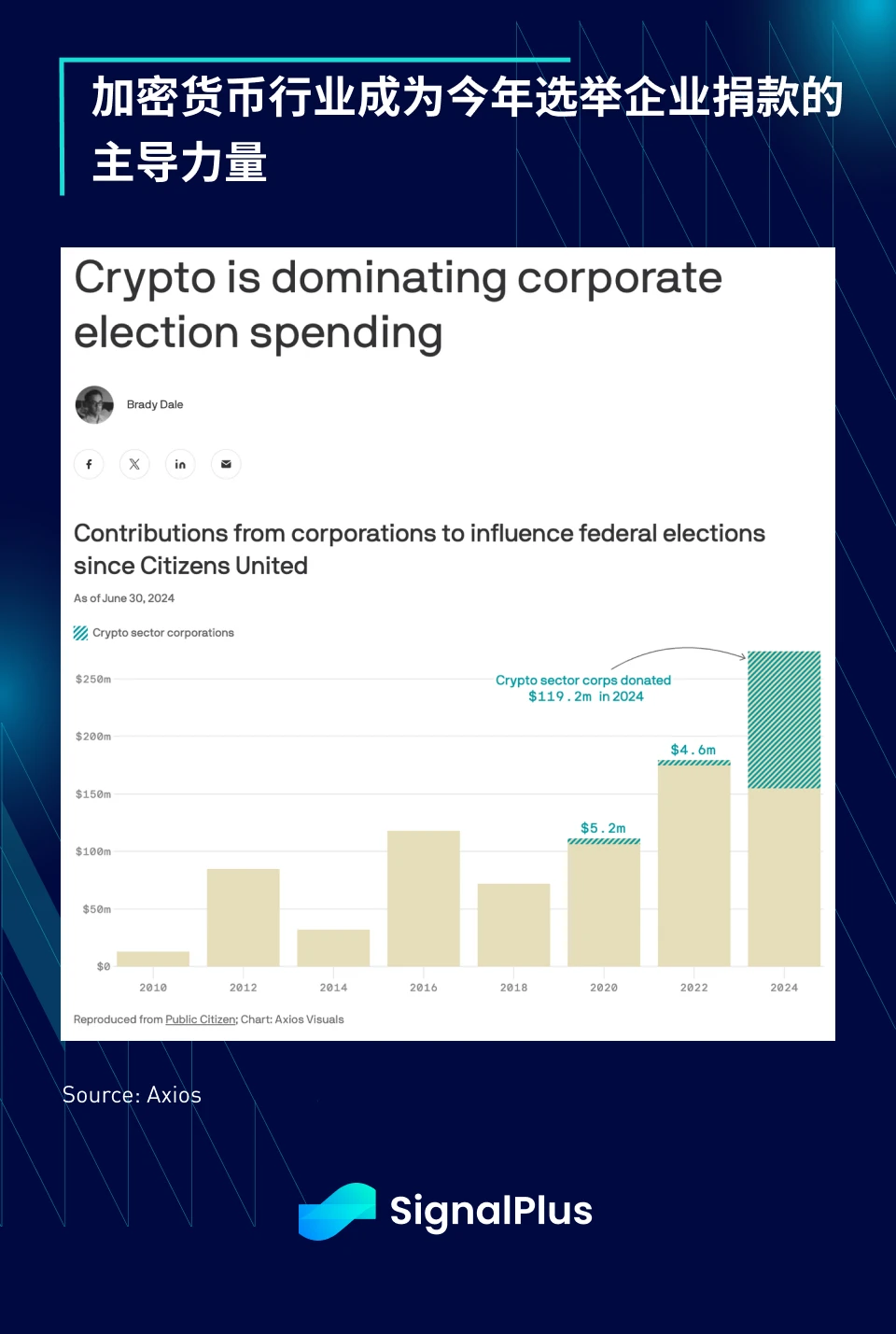 正面消息方面,Axios 报告称,加密货币已成为今年选举企业捐款的主导力量,迄今贡献了约 1.2 亿美元,占企业捐款总额的近一半,尽管捐赠金额主要来自少数重大捐款者,但整个行业仍希望在本届选举中能取得更有利的政治支持。