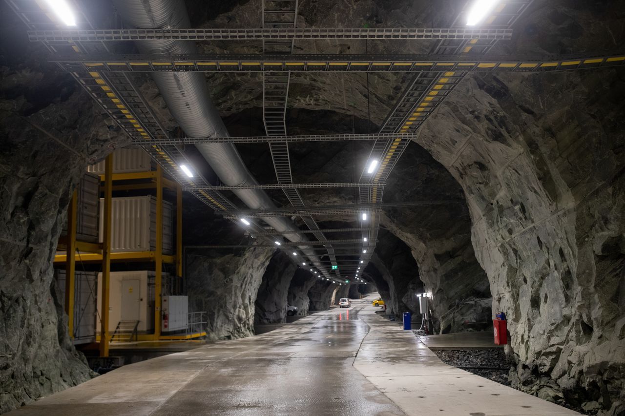 Northern Data 数据中心的一条通道,Northern Data 数据中心是一座废弃的挪威矿井