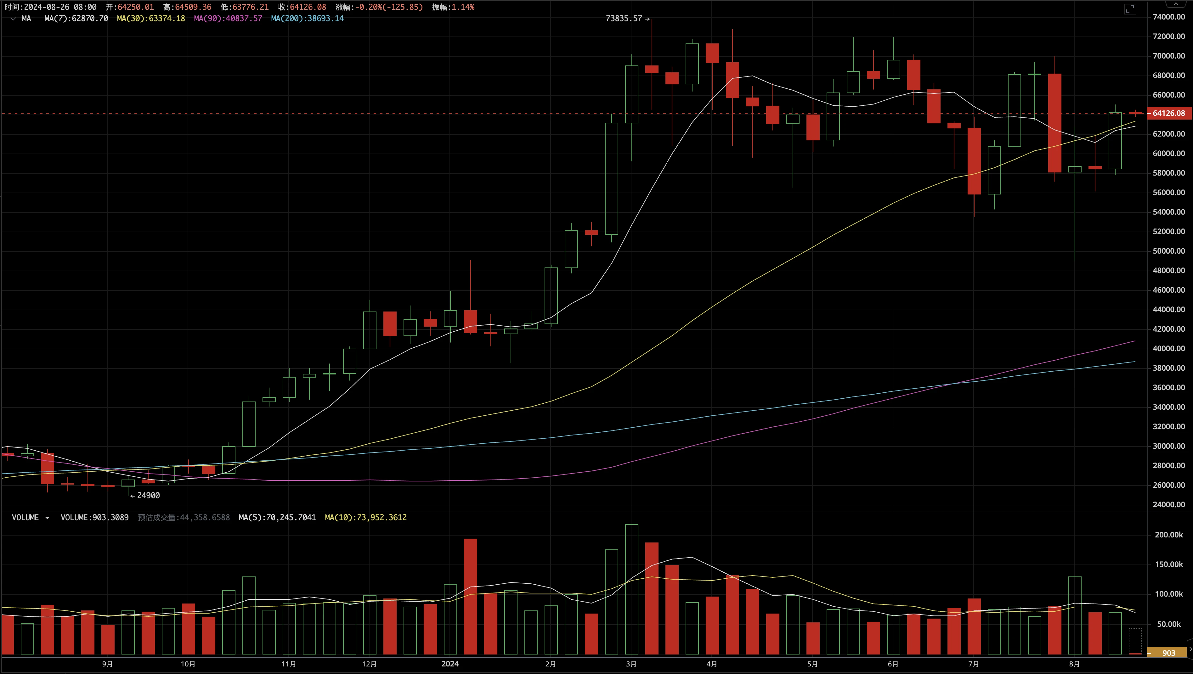 随着周五美联储主席鲍威尔的讲话透露降息落定,美股放量上涨,BTC 也一举摆脱 200 天线压制,彻底摆脱转熊疑云。