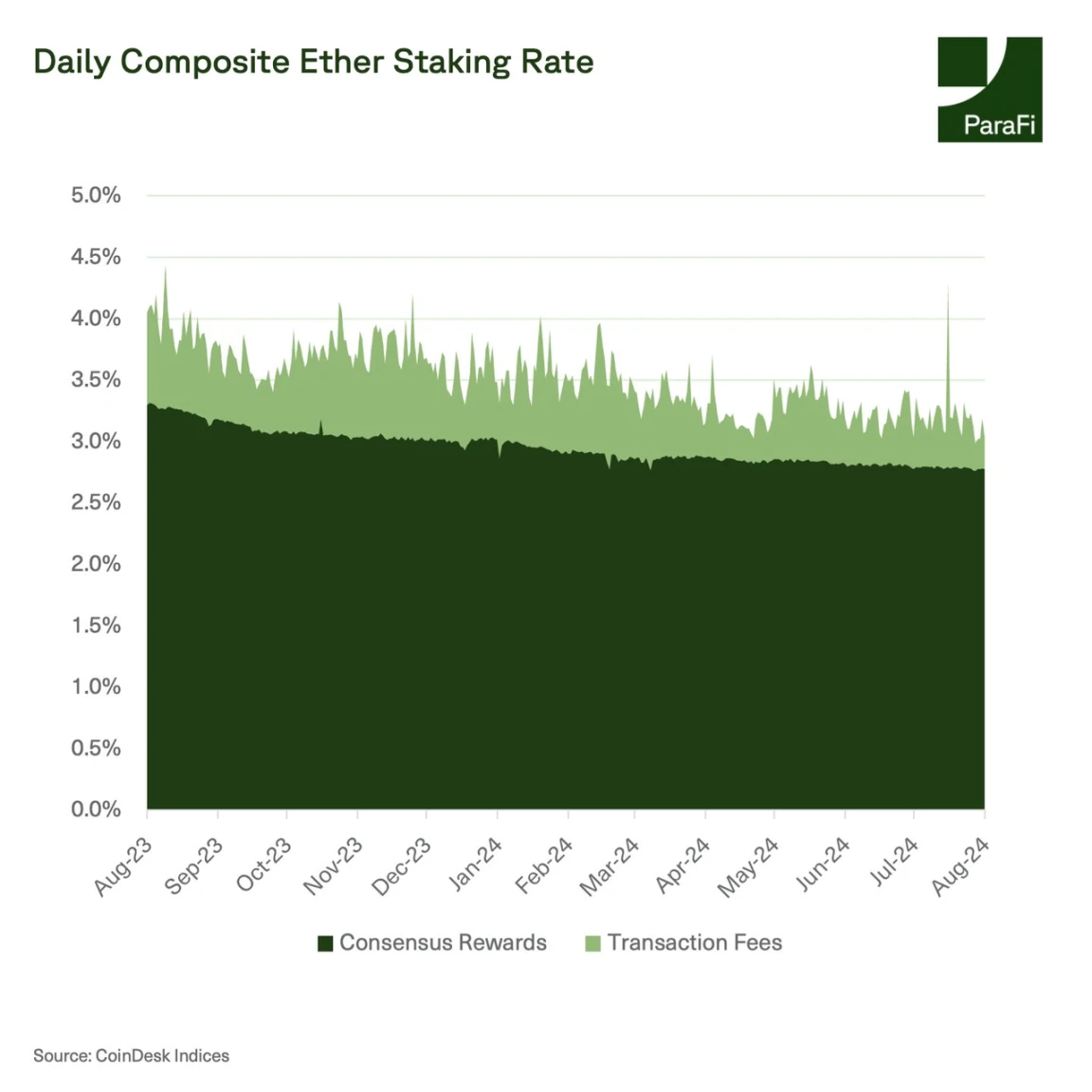 过去的 12 个月里,ETH 质押奖励率一直呈下降趋势,因为以太坊验证者的数量在过去一年中增长了 79% ,而 L1 交易费用却有所下降。