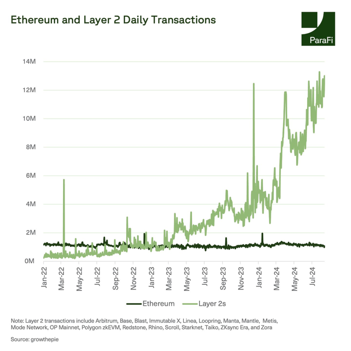 过去的两年半时间中,以太坊的交易笔数相对停滞,而 L2 的总交易笔数在 2024 年 8 月超过 L1 的 10 倍。
