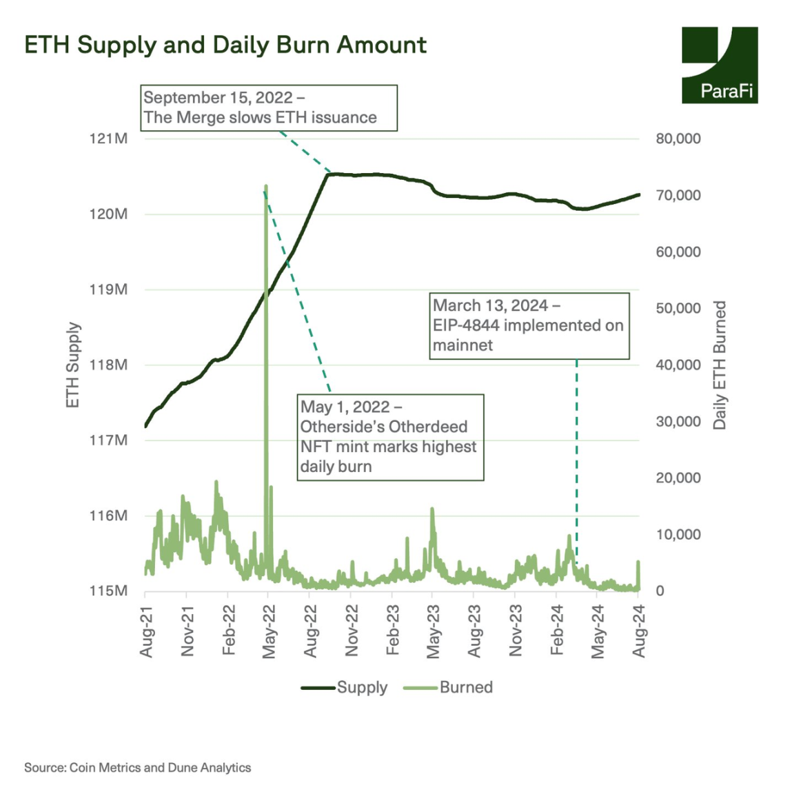 EIP-1559 与合并升级之后,人们对 ETH 作为产生现金流资产的经济性感到兴奋。在最初两次升级后,ETH 的供应量确实下降了,从 2022 年 9 月到 2024 年 4 月,下降了约 0.38% 。不过从那时起,随着销毁率的放缓,ETH 供应量就开始一路攀升。
