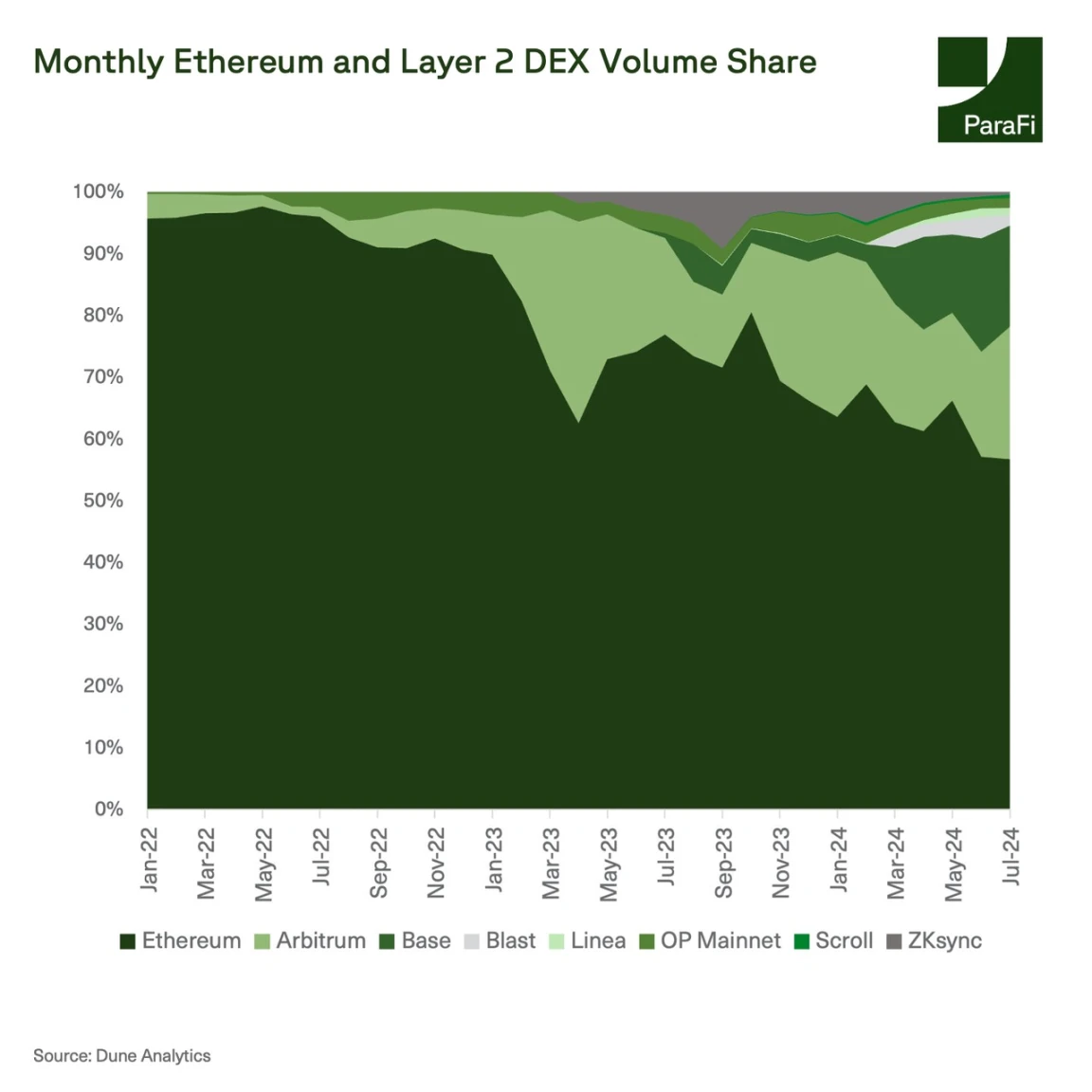 以太坊 L2 的日益增长也体现在它们从以太坊吸引了大量的 DEX 市场份额。EIP-4844 升级后,L2 已经将以太坊主网上的 DEX 市场份额压低至 60% 以下。