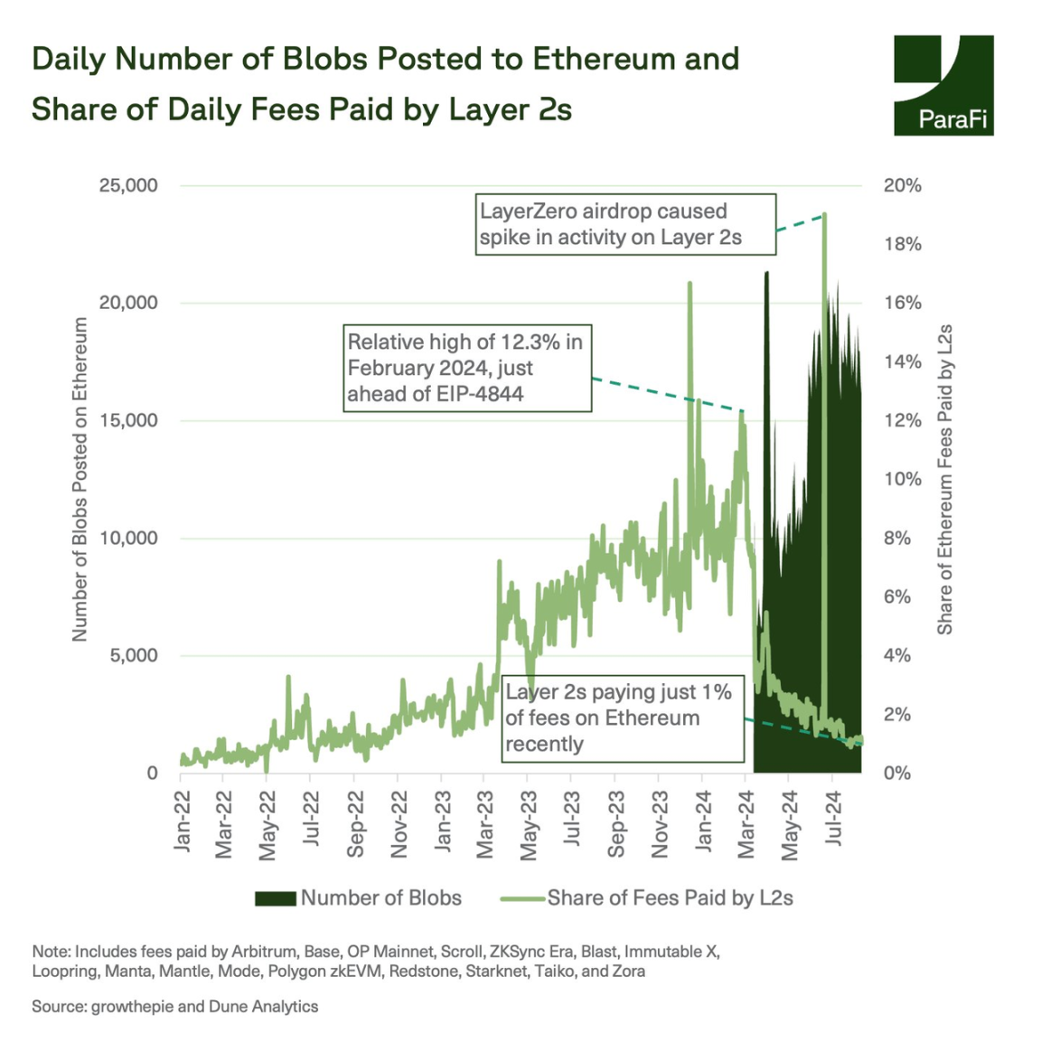 由于 L2 需要在链上发布大量的交易概要数据,它们迅速采用了 blobs。自 6 月初以来,以太坊每天至少有 1.6 万个 blobs 被发布。这导致主要 L2 所支付的总费用比例下降,从 2024 年的 12% 降至 1% 。