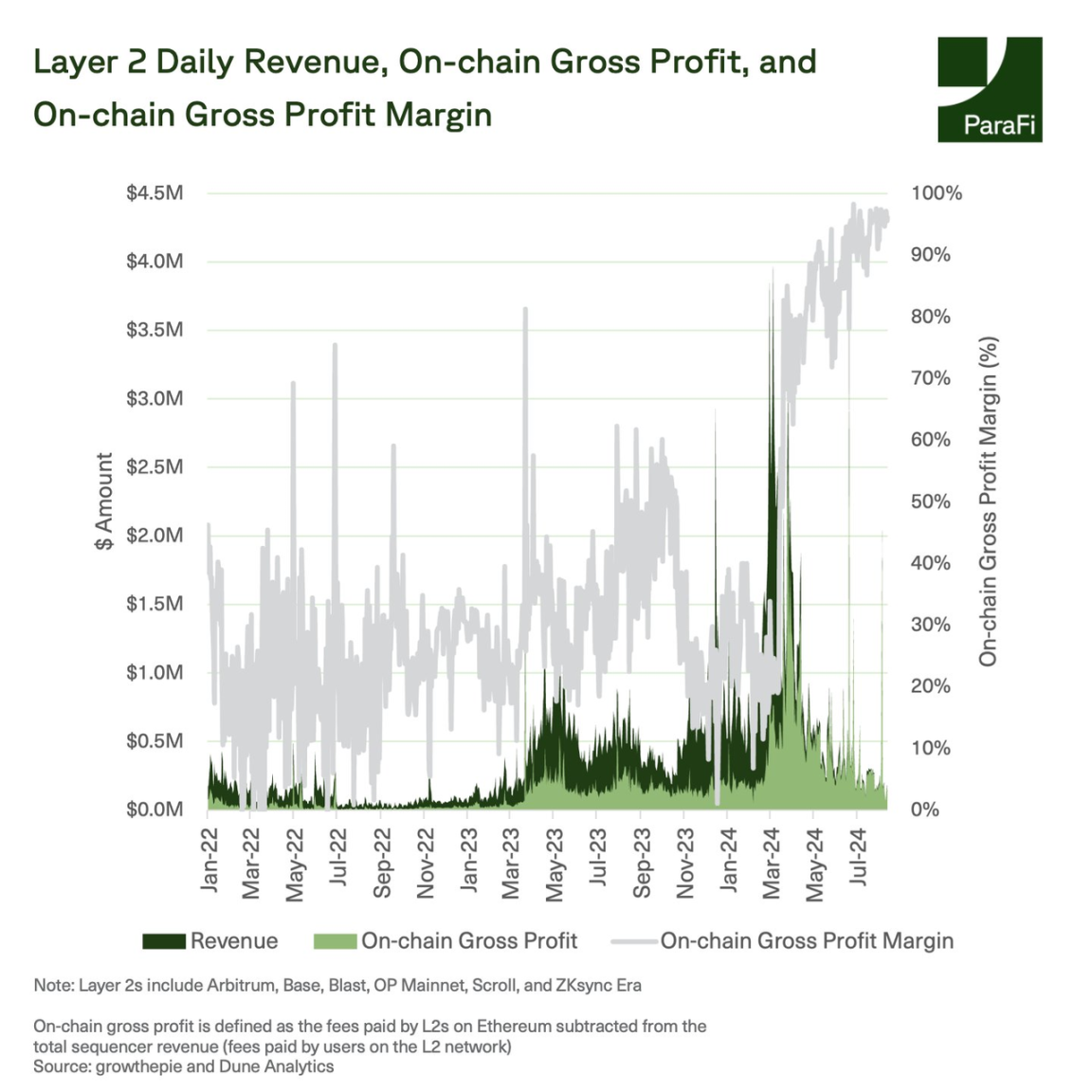 尽管 L2 使用量激增,但对 ETH 作为资产的直接收益尚不明确。过去几个月中,尽管 L2 的利润大幅上升,但 ETH 的销毁率下降,导致流向 ETH 的价值减少。