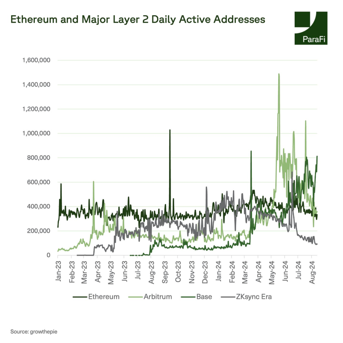 L2 活动的增长可以归因于新 L2 的推出和一些现有 L2 的爆炸式发展。3 月以来,Base 和 Arbitrum 的单日交易笔数都超过了以太坊。虽然这张图表汇总了多个 L2 的交易,但每个 L2 都在为以太坊提供替代的区块空间,突显出 L1 向 L2 转移的大趋势。