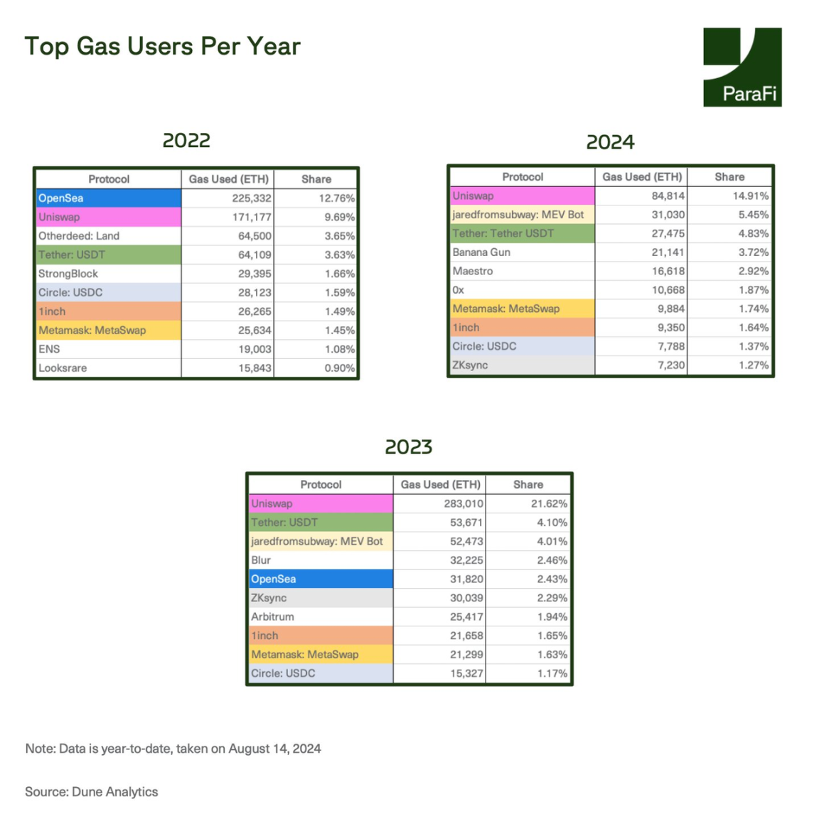 虽然销毁速度有所放缓,但 Uniswap、Tether、1inch 和 MetaMask 等应用或协议继续推动以太坊上的大部分 Gas 消耗。2023 年,Arbitrum 和 ZKsync 是主要的 Gas 消耗者,但今年其数据明显下降,这是因为 EIP-4844 提案使得 L2 可以更高效地发布数据,降低了其数据存储要求。