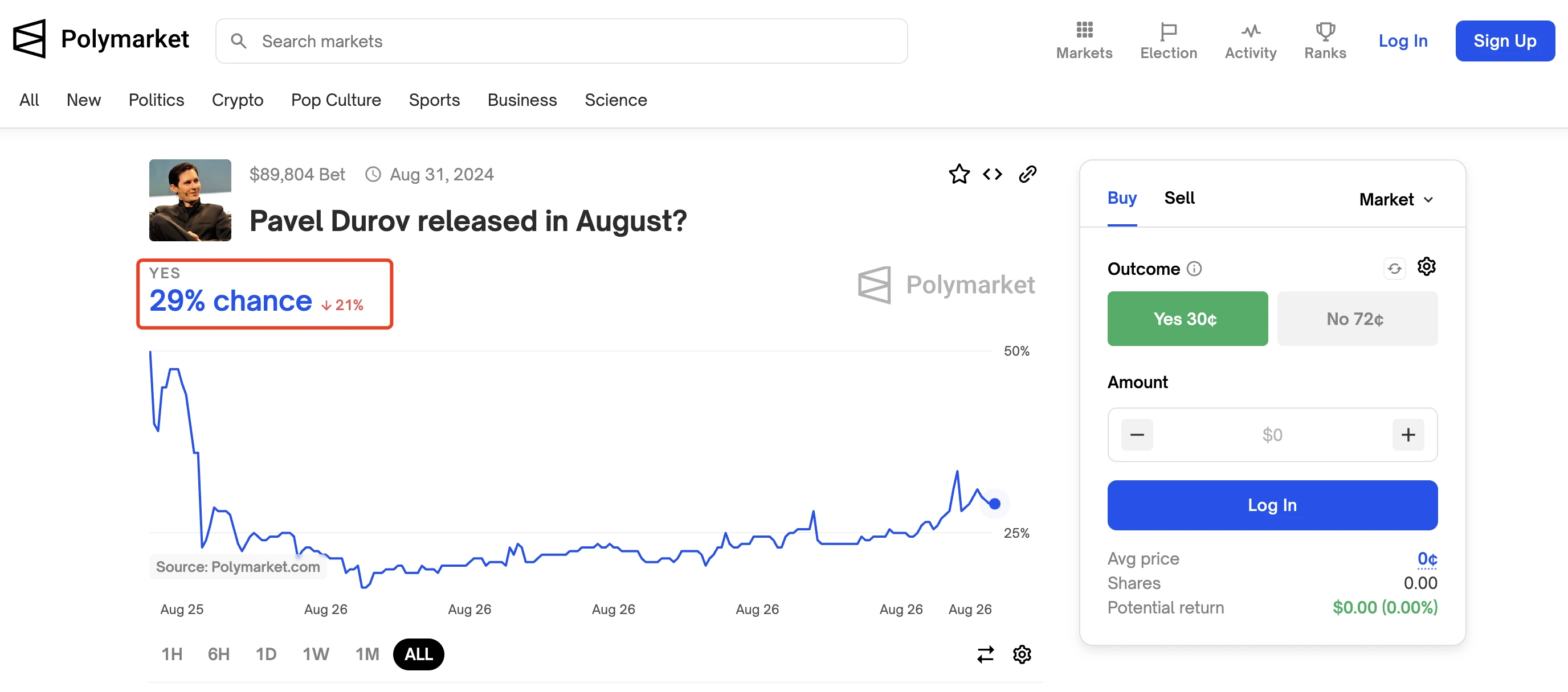 不过,从预测市场的反馈来看,此事短时间内解决的可能性较小: Polymarket 平台显示 ,当前预测 Telegram 创始人 Pavel Durov 于 8 月获释的概率已经从上周日首次创建时的 50% 下降至 29% ,受此前法国当局和司法程序将对 Pavel Durov 进行审前拘留的消息影响。