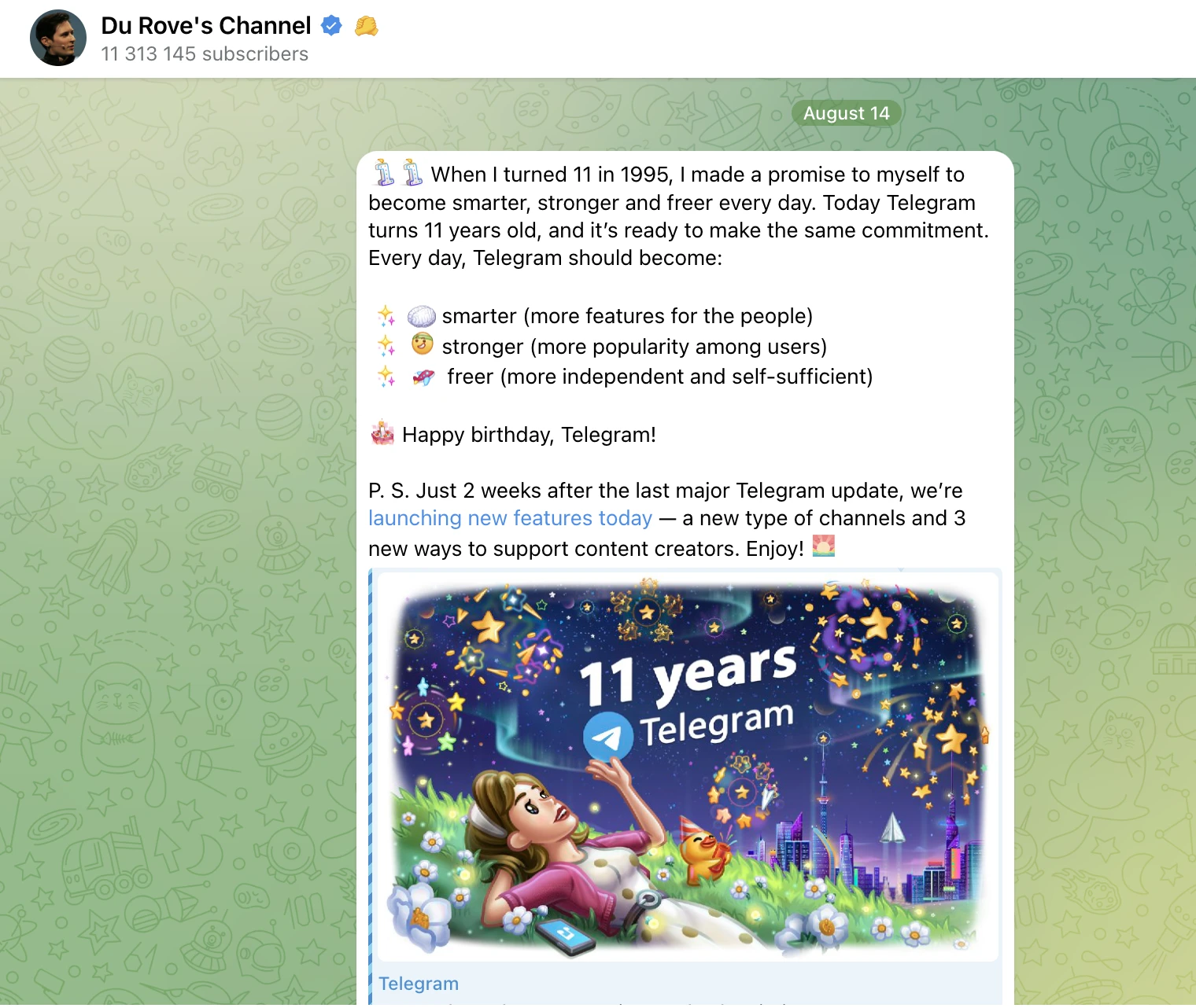 值得一提的是,Pavel Durov 曾于 8 月 14 日在个人 Telegram 频道庆祝该平台创建 11 周年,并 提到 :“ 1995 年我 11 岁时,我对自己做出了一个承诺,每天变得更聪明、更强壮、更自由。今天 Telegram 已经 11 岁了,它准备做出同样的承诺。每天,Telegram 应该变得:更智能(为用户提供更多功能);更强大(在用户中更受欢迎);更自由(更独立和自给自足)。生日快乐,Telegram!P.S.就在上次大型 Telegram 更新后的 2 周后,我们今天发布了新功能——一种新类型的频道和 3 种支持内容创作者的新方式。尽情享受吧!”