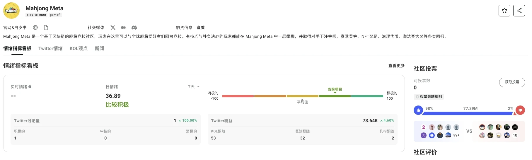 Mahjong Meta:一个专注于麻将电竞的Web3游戏平台,旨在为玩家提供链上麻将主题公园。不同于传统的射击类电竞游戏,Mahjong Meta 更适合长期用户,通过结合电竞机制,该平台能够吸引并留住玩家,具有很大的长线运营潜力。