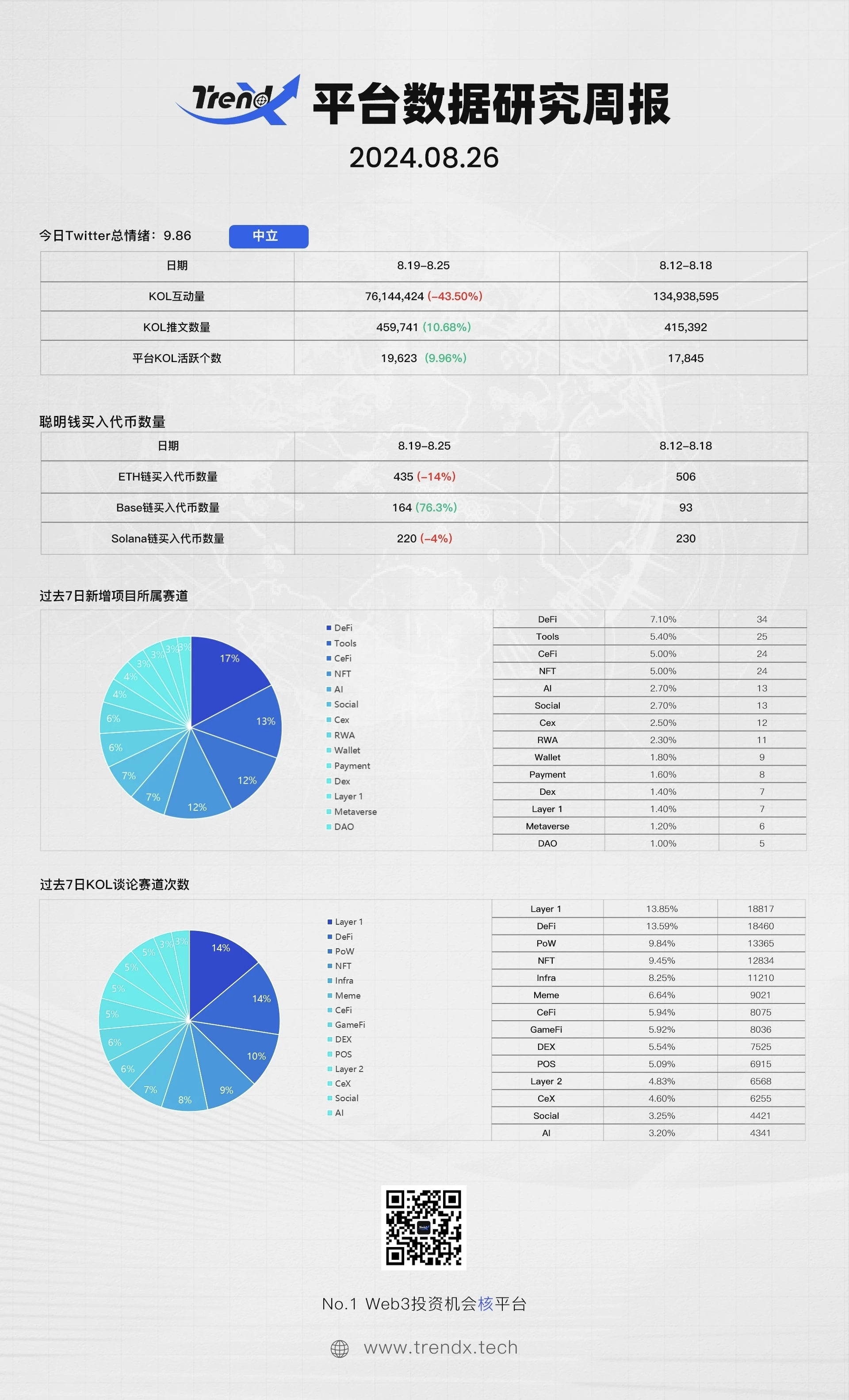 以上为 TrendX 本周的平台数据,我们可以看到,相较于 8 月 12 日-8 月 18 日,上周整个市场情绪面开始收窄,这可能和 Telegram 创始人被抓有关,一定程度上加深了市场对行业未来发展前景的担忧。
