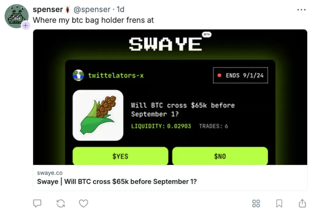 利用现有的社交媒体渠道是吸引更多用户和提升预测市场参与度的有效方式。通过与 Farcaster 和 Solana 的 Blink 等平台集成,预测市场可以利用已建立的网络进行分发和用户互动。像 Swaye 和 Bookie 这样的项目已经在朝这个方向发展,使用户能够直接在社交动态中分享他们的预测,创造病毒式传播的时刻并推动参与。