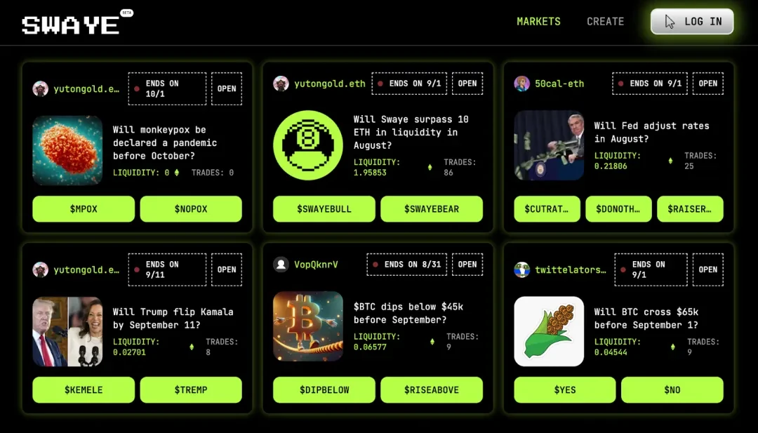 Swaye 在这一领域进行创新,允许用户创建与事件结果相关的市场,参与者甚至可以创建或交易与这些结果相关的表情包币。那些对传统平台上的高机会成本和无法创建市场感到沮丧的用户可以转向 Swaye,在那里他们可以生成市场并赚取费用。例如,用户可能会创建一个市场,预测猴痘病毒是否会在特定日期之前被宣布为流行病毒。结果代币,如 $MPOX 和 $NOPOX,将代表可能的结果,失败的代币将归零,而成功的代币可能会成为永久的 memecoin。