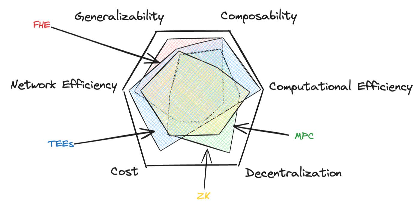 随着区块链生态系统的发展,几种关键的隐私增强技术 (PETs) 相继出现,每种技术都有其独特的优势和权衡。这些技术包括零知识证明 (ZK)、多方计算 (MPC)、完全同态加密 (FHE) 和可信执行环境 (TEE),它们涵盖了六个关键公理。