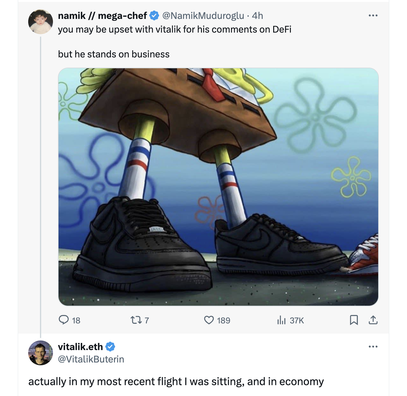 针对 Vitalik 收到的反对声音,有人替他辩解到:「你可能会因为 Vitalik 对 DeFi 的评论感到不满,但他是 站在商业的立场上 。」Vitalik 在回复中幽默回应:「事实上, 我在最近的飞行中是坐着的,而且坐的是经济舱。 」