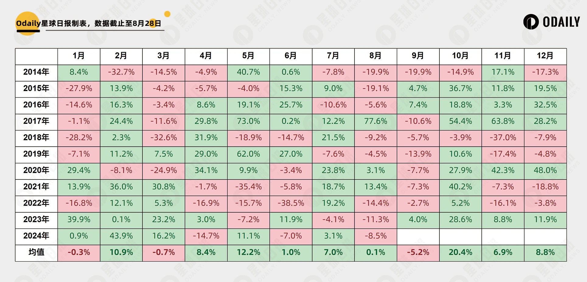 Odaily 统计了过去自 2014 年以来 BTC 的每月表现数据如下,从每月表现均值来看,仅有三个月份平均是下跌的, 且只有九月存在显著的跌幅,且下跌的年份占比也最多 。但熬过了 9 月,就是上涨比例和幅度最大的 10 月。