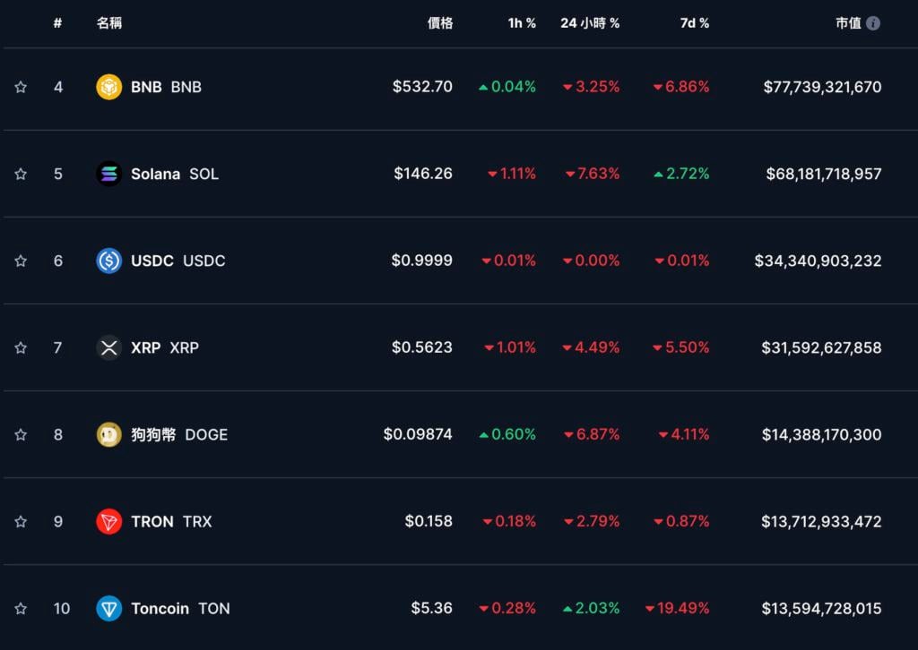 CoinMarkeCap 数据 显示 ,其他前十大代币近 24 小时也多数下挫:跌幅最大的是 SOL,近 24 小时下滑 7.63%,XRP 和 DOGE 也分别下跌 4.49%、6.87%。