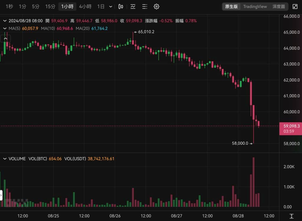 撰搞当下似乎仍在準备二次探底,暂报 59,090 美元,近 24 小时下跌 6.32%。