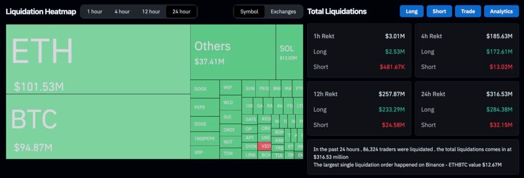 比特币大幅波动下,据 Coinglass 数据 显示,过去 24 小时,加密货币全网爆仓金额超过 3.16 亿美元(多头占 2.8 亿美元),有超 8.6 万人遭清算。