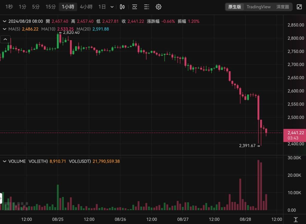 以太坊走势与比特币相近,清晨六点后最低下杀 2,391 美元,撰稿当下暂报 2,441 美元,近 24 小时下跌 9.09%。