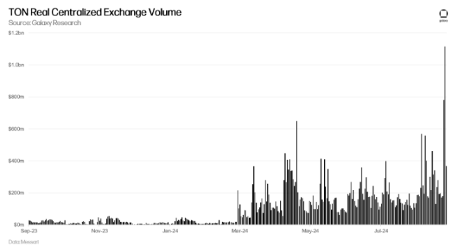 根据 Messari 的计算(去除刷量交易后),中心化交易所中 TON 近日交易量在 2 亿至 6 亿美元之间,其中 2024 年 8 月 25 日(星期日)的交易量为今年最大的一天,超过 10 亿美元。