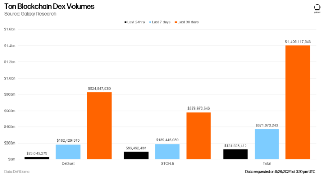 TON 网络上 DEX 的 30 天总交易量约为 14 亿美元。