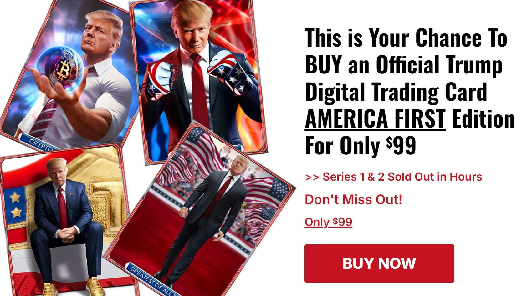 8 月 27 日晚 10 点半,美国前总统、 2024 年大选共和党候选人特朗普在自己的社交媒体平台 Truth Social 上公布了此前预热过的第四系列 NFT:“特朗普数字交易卡,第四系列:美国优先”。购买 75 个 NFT(价值 7425 美元)以上,就可以获得和特朗普在佛罗里达州共进晚餐的机会,以及限量版球鞋等多项权益。