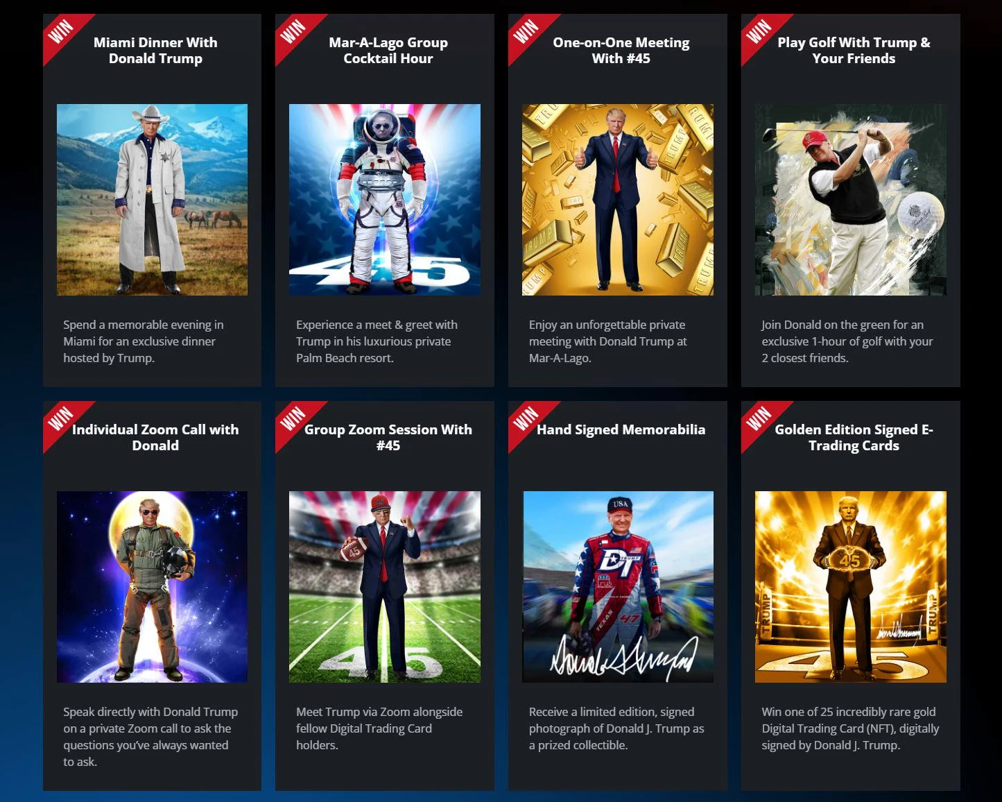 该网站还提供了更多数量的购买档位,比如买 9 张、 15 张、 75 张、 250 张。如果购买 15 个 NFT(1485 美元),就可以获得 6 月 27 日辩论的一块特朗普穿的西装的碎片,限量 2024 块,有些还有签名,同时获得一双铂灰色高帮运动鞋,两双金色低帮运动鞋,以及其他奖励。如果购买 75 个 NFT(价值 7425 美元),可以获得和特朗普在佛罗里达州共进晚餐的机会,以及限量版球鞋和以上提到的相关奖励;如果购买 250 个 NFT(价值 24750 美元),可以获得两张 VIP 晚宴门票,并在晚宴前与特朗普共饮鸡尾酒,并获得球鞋,以及限量 25 个、唯一版本的比特币铭文 NFT,可谓噱头十足。