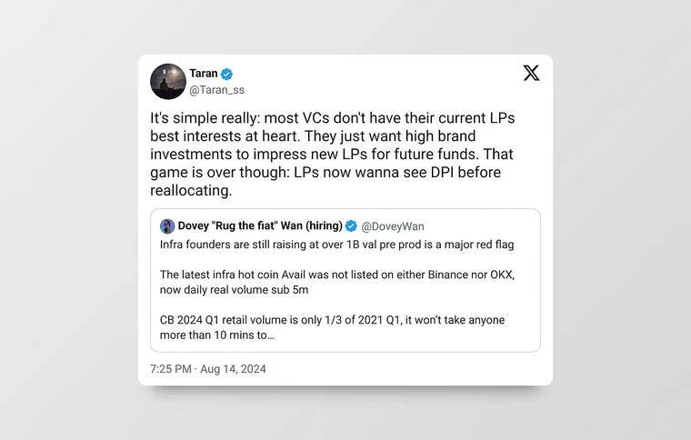 鉴于基础设施项目(如 Rollup/ 互操作性 / 重新质押)动辄 10 亿美元以上的 FDV,而在 2021-2022 年,就有数十亿美元从基础设施领域退出,因此,将资金部署到基础设施是大型 VC 们的最佳选择。但这是在硅谷资本和合法性引擎推动下,大型 VC 们自己创造的叙事。