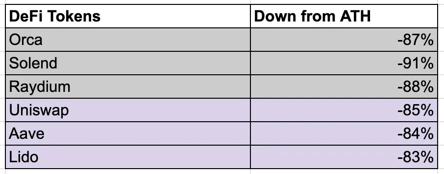尽管有人可能会说 Solana DeFi 代币的价格大幅下跌,但以太坊的 DeFi 蓝筹也是如此,这是治理代币价值累积的结构性问题。