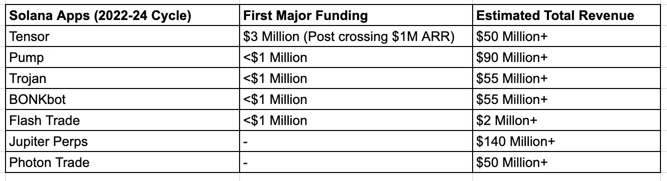 而 Solana 上的应用不需要过多关注基础设施,基础设施由一些可靠的 Solana 基础设施初创公司(如 Helius / Jito / Triton 或协议集成)负责。一般来说,应用不需要足太多的资金即可启动,比如 Uniswap、Pump/fun 和 Polymarket。