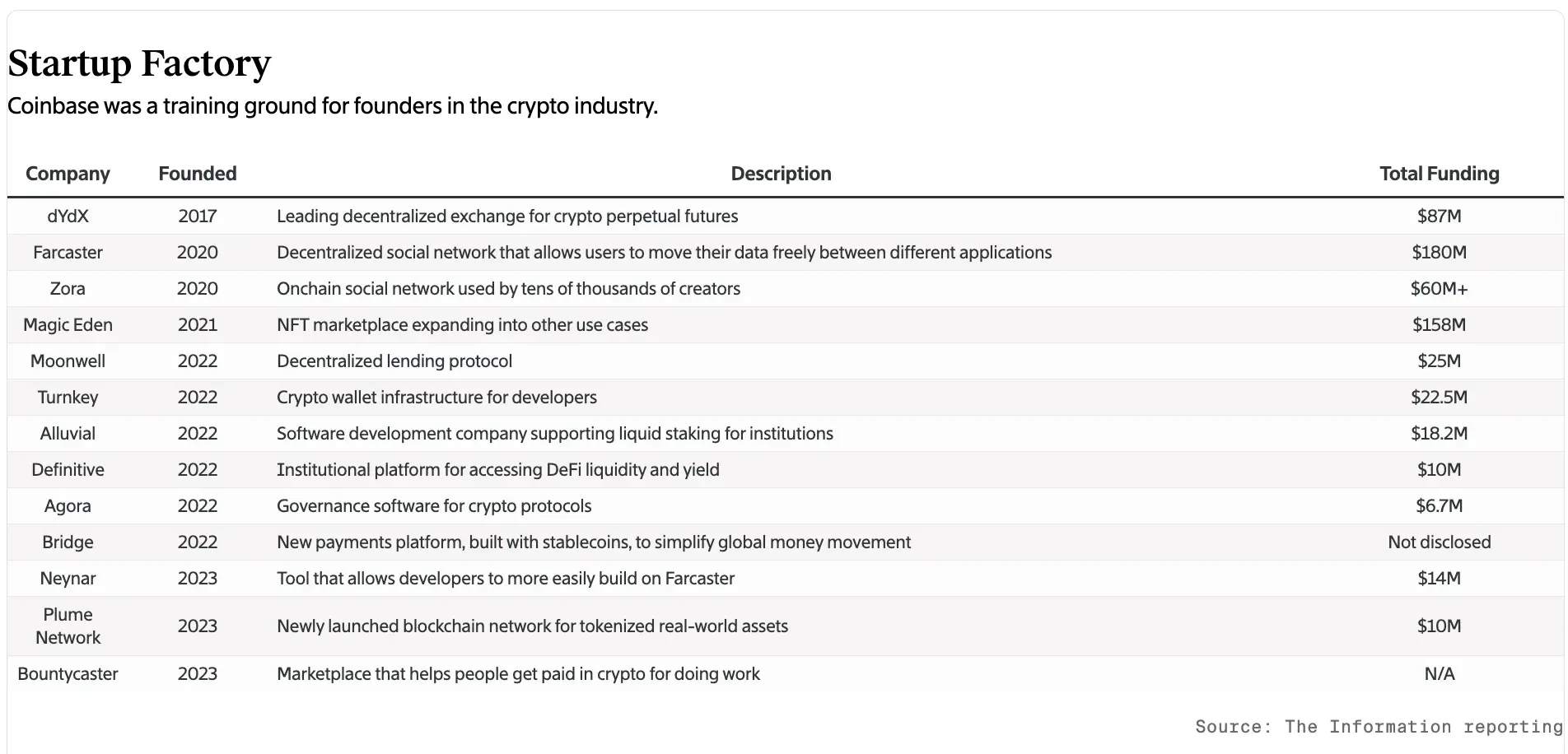 Coinbase Ventures 最终成为 Youngblood 新公司的早期股东。根据公司的统计,多年来,Coinbase 的员工们已经创办了大约 100 家获得风险投资支持的初创公司,涵盖了从非同质化代币市场到去中心化金融和社交媒体网络的各个行业。