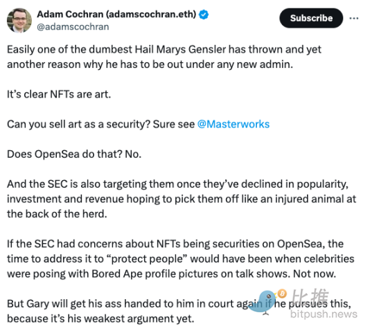 「SEC 现在正试图声称 NFT 是证券。下一步是什么?棒球卡?漫画书?Gary Gensler 针对加密货币的恶意和非美国战争正在扩大。数字 web3 创作者和艺术家现在成为众矢之的」。