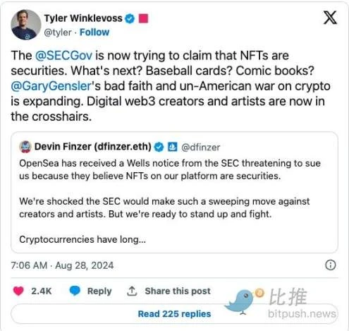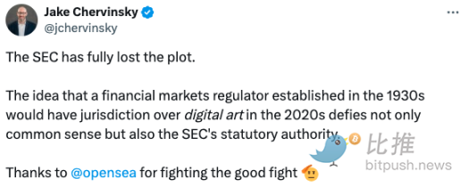 「SEC 已经完全失去了主见。一个成立于 20 世纪 30 年代的金融市场监管机构将在 2020 年代对数字艺术拥有管辖权,这一想法不仅违背了常识,也违背了 SEC 的法定权力。感谢 Opensea 为正义而战」。