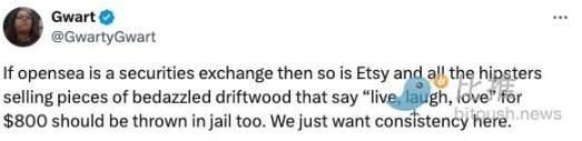 「如果 Opensea 是证券交易所,那么 Etsy 也是,所有以 800 美元价格出售的、雕刻着『生活、欢笑、爱』的木制艺术品的卖家也应该被关进监狱,如果希望保持一致性的话」。