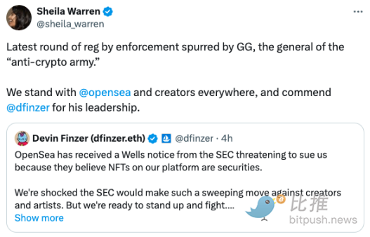 「最新一轮的监管执法是由“反加密货币大军”GG 发起的,我们支持 opensea 和世界各地的创造者,并赞扬@dfinzer 感谢他的领导」。