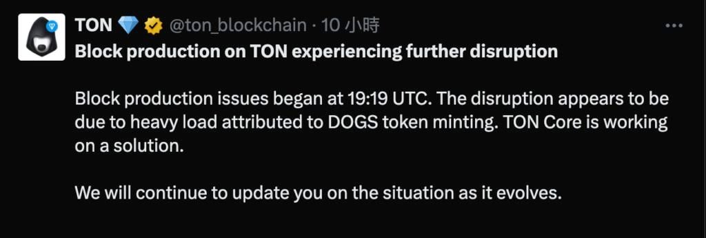 区块生产问题于 UTC 时间 19:19 𫔭始。此次中断似乎是由于 DOGS 代币铸造造成的重载造成的。 TON Core 正在研究解决方案。