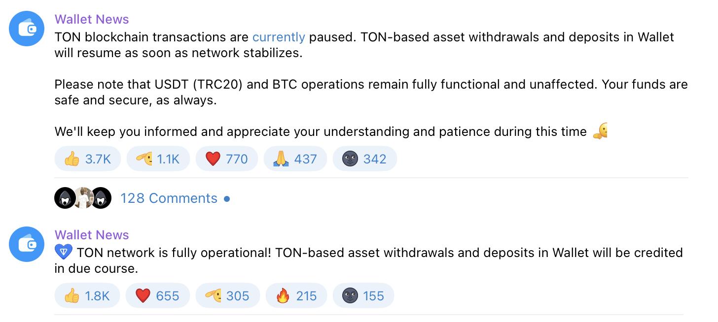 直到早上 7 点半左右,Telegram Wallet 官方 TG 频道再度宣布,TON 网路已全面恢复运行,基于 TON 的资产提现和存款将适时到帐。